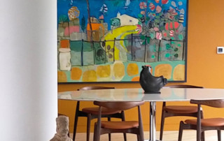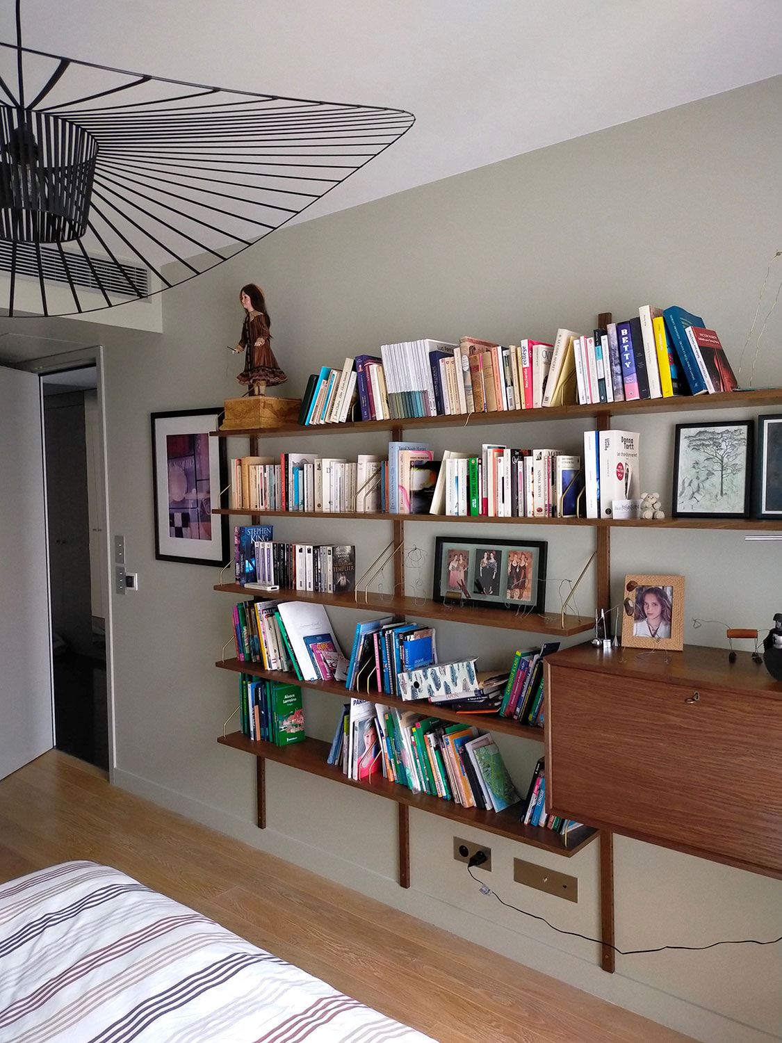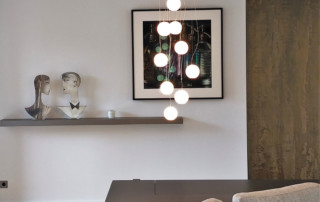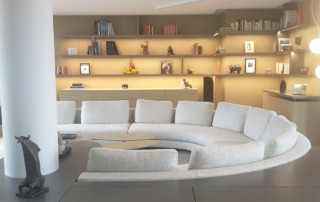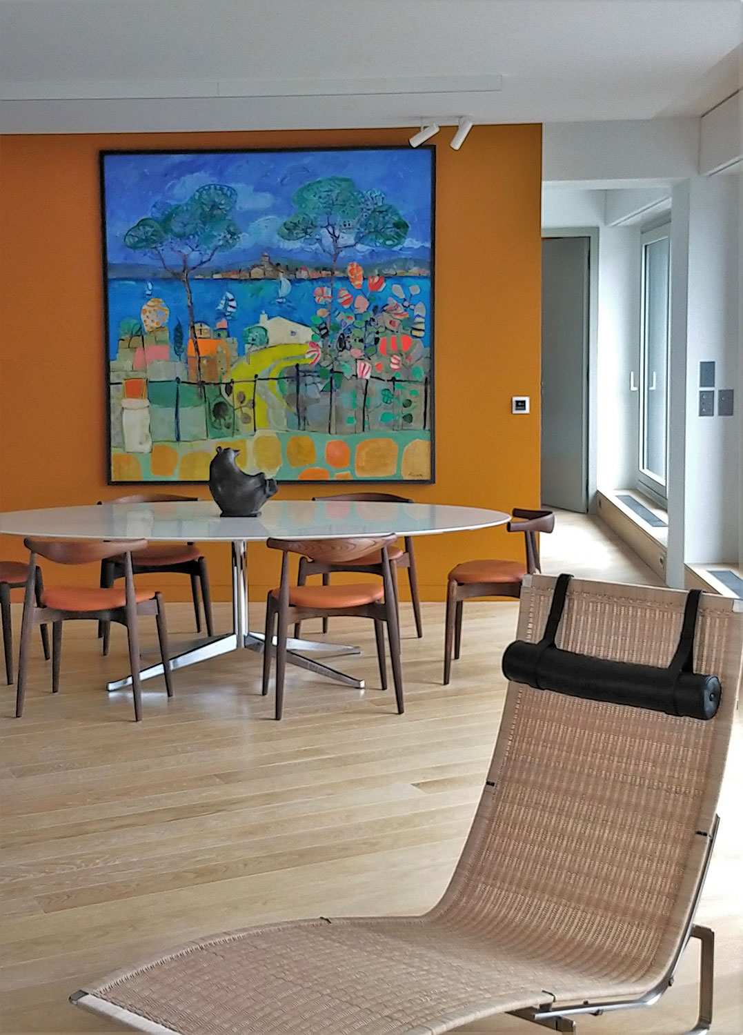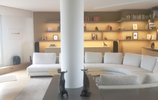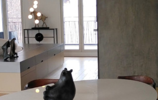 200m² apartment in a recent building. Completely redone. This very bright apartment is surrounded by bay windows that look directly into the sky. Straight parquet floor in light oak, Heynault blue stone, celadon enamelled lava TRADITION PIERRE painting ARGILE, sliding door PIERRE BONNEFILLE, KREON lighting, OCTAVIO AMADO alabaster chandelier. Carpet TOULEMEONDE BOCHART Agency and bespoke kitchen COPEAUX SALMON